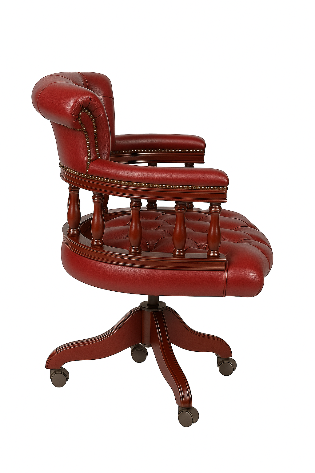 A generously cushioned seat invites lasting comfort throughout the working day, supported by a solid hardwood frame built for strength, stability, and longevity. Beneath its stately silhouette, a smooth swivel base and discreet castors allow effortless movement, seamlessly blending practicality with poise.